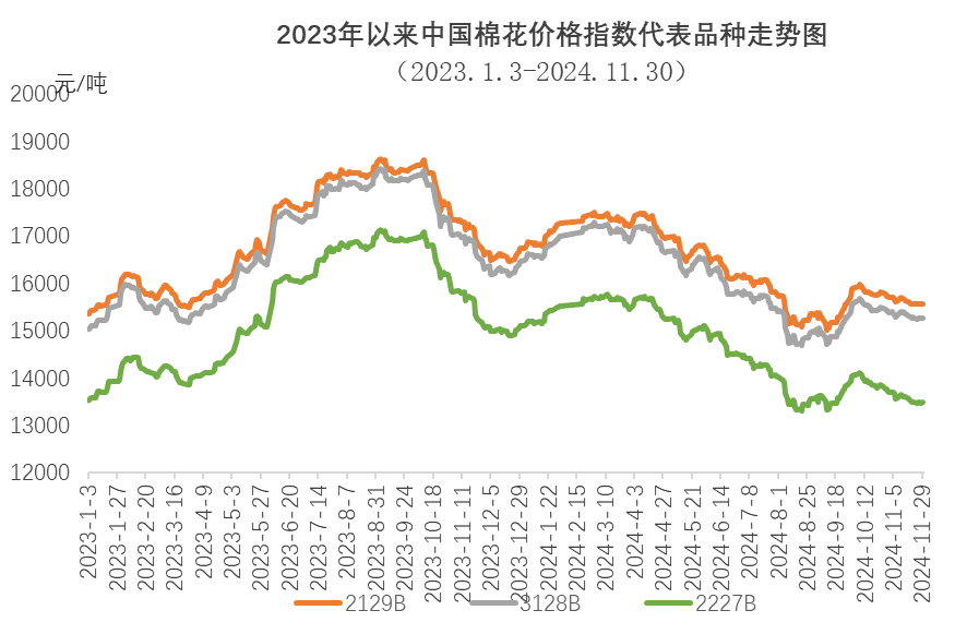 11月,国内新棉上市量大幅增加,供应端压力持续,棉纺织行业进入传统淡季,下游订单整体走弱,成品库存累积上升,部分企业为减少压力降价销售,皮棉采购较为谨慎,国内现货价格震荡走低。同期,受美国大选结果、美联储降息预期反复、美棉装运数据创年度新高等因素影响,国际棉价先跌后涨,走势强于国内,内外棉价差有所收窄。
