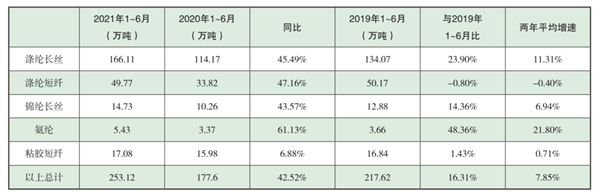 上半年,化纤行业总体开工负荷较2020年同期明显提升,固然有2020年同期基数较低的因素,但和近几年来同期水平相比也是处于高位。据国家统计局数据,1~6月,化纤产量为3337万吨,同比增加17.12%。为了避免由于2020年低基数而造成的高增长对行业运行态势的误判,我们以2019年上半年为基期,采用几何平均法计算(下同),化纤产量两年平均增速为9.10%。