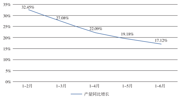 分月度来看,随着去年春节后行业复工复产的快速推进,化纤产量基数快速提高,导致今年1~6月的产量同比增速逐月回落(图1)。