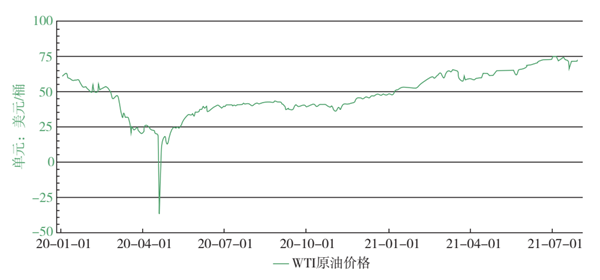 2021年以来,在需求恢复及通胀预期的背景下,大宗商品市场持续走强。同时,石油输出国组织OPEC继续执行减产,严格控制原油供应量。因此,1~6月国际油价持续上涨,WTI原油价格由年初的50美元/桶左右,6月份突破70美元/桶,超过新冠疫情暴发之前的油价水平(图2)。