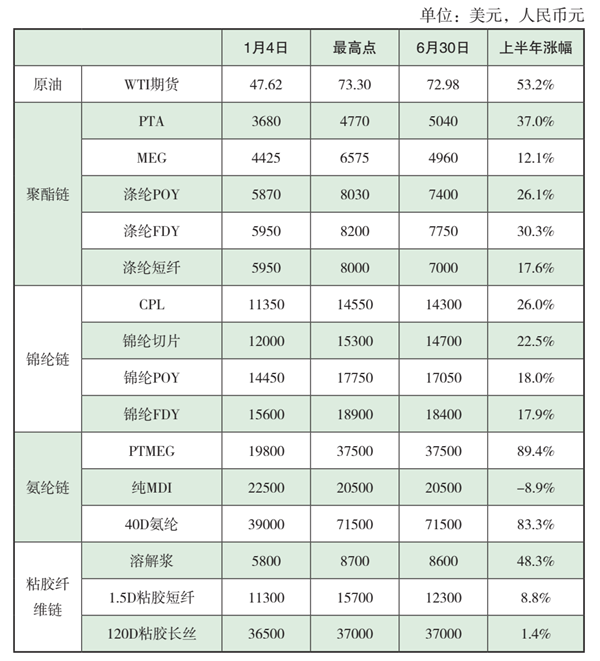 受原油价格走高影响,化纤成本随之节节攀升,1~6月化纤市场价格涨幅明显。据中纤网数据,6月底化纤主要产品价格较年初有不同程度的上涨,但对比产业链各环节产品价格涨幅,可以看到化纤产品价格涨幅普遍小于其主要原料和原油涨幅(表1),因此可以判断1~6月化纤市场是成本推动型上涨。