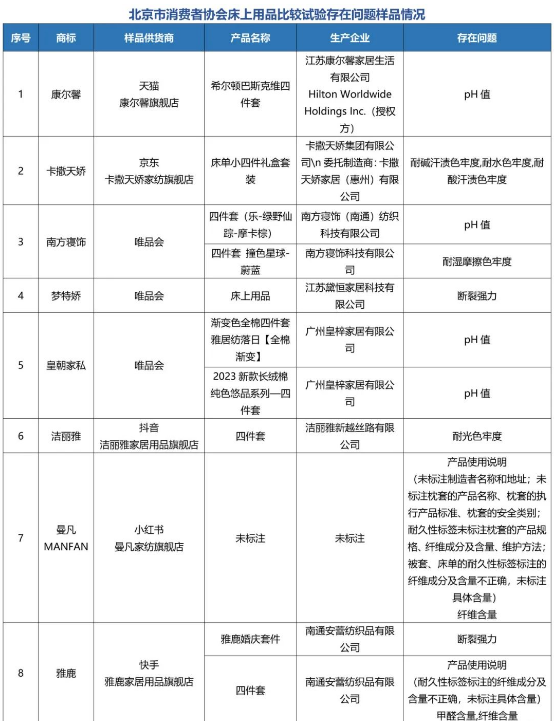 北京市消费者协会日前对电商平台购买的80件床上用品进行了比较试验,其中22件不达标,涉及猫人、无印良品、洁丽雅、雅鹿等15个品牌。
