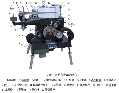 结构原理:电机经传动机构带动精密凹凸导轮检测纱条变化,通过机械杠杆放大,画出不匀曲线。